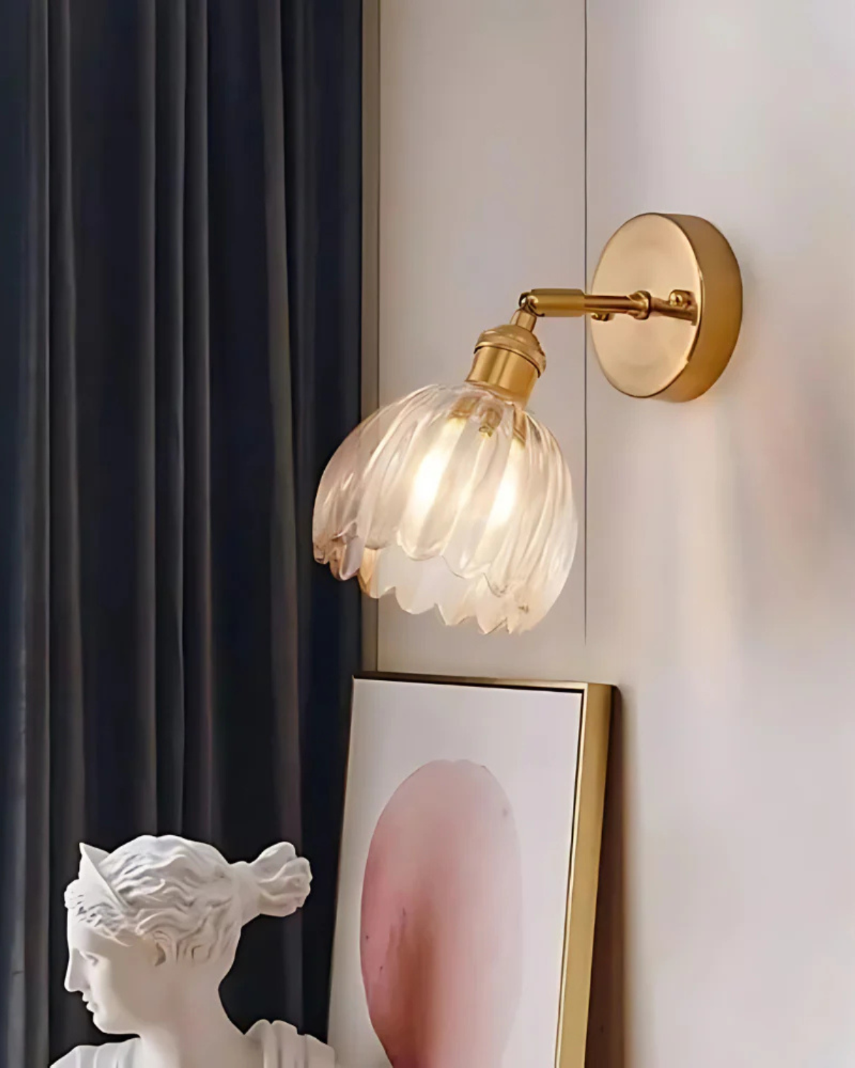 Diese Wandleuchte kombiniert eine klassische Wandhalterung aus Metall mit einem dekorativen, weißen Glasschirm in Blütenform. Die abgerundeten, gewellten Ränder des Glases sorgen für eine weiche Lichtverteilung und verleihen jedem Raum einen Hauch Nostalgie. Ideal geeignet für Flure, Schlafzimmer oder neben einem Lesesessel, wo stimmungsvolle Akzentbeleuchtung gefragt ist.
